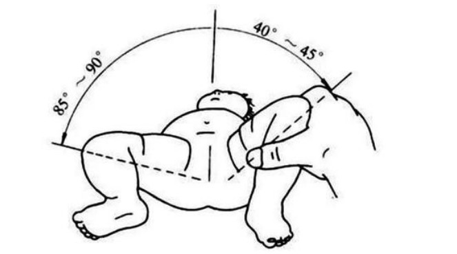將孩子俯臥在床上,觀察其臀部下側(cè)的橫紋。正常情況下,兩側(cè)臀紋對(duì)稱,數(shù)量相等,如果出現(xiàn)不相等或數(shù)量不一時(shí),應(yīng)及時(shí)帶孩子到醫(yī)院檢查髖關(guān)節(jié)。