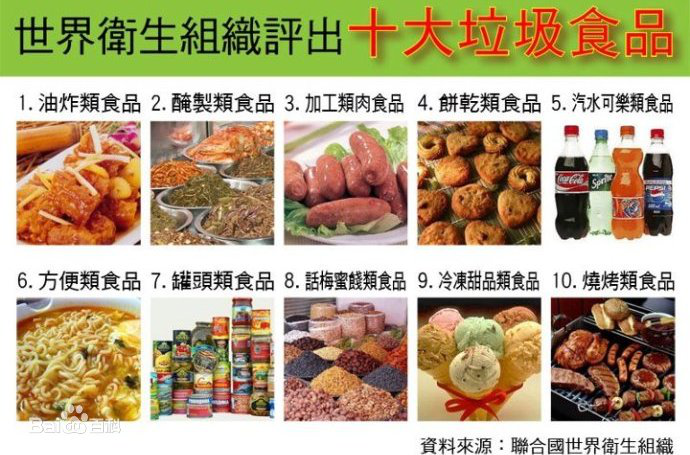 薯條、漢堡、方便面、炸雞……當你準備吃這些食物的時候,是不是總有人跳出來給,一本正經(jīng)的給你說:垃圾食品,少吃不吃為妙。在你的資訊接受范圍內(nèi),幾乎每過一段時間就會有關(guān)于“垃圾食品”的報道,特別是“世衛(wèi)組織公布的十大垃圾食品”的圖片更是廣為流傳。