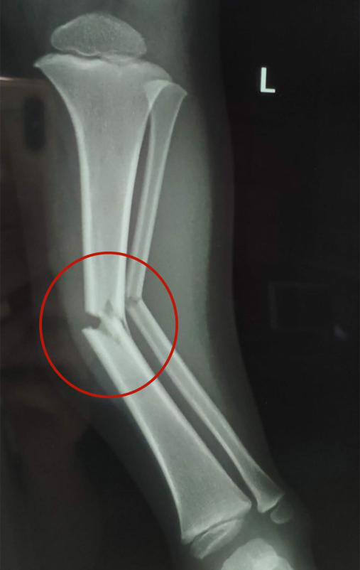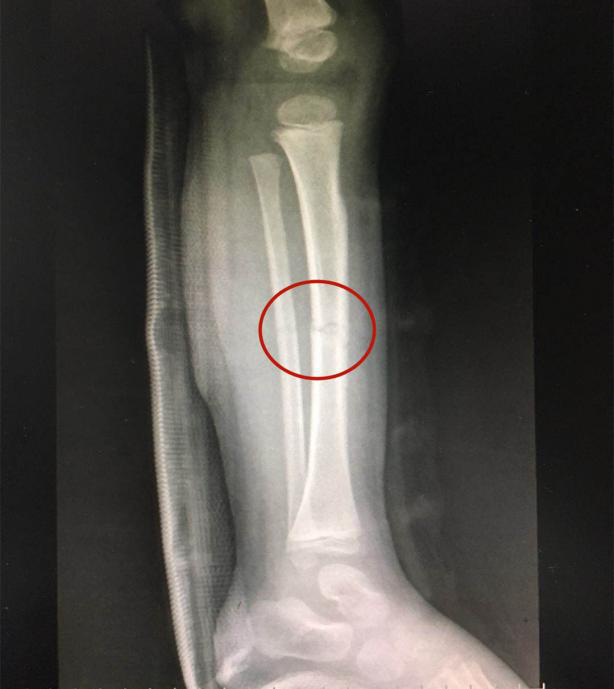 經(jīng)當?shù)蒯t(yī)院照X光顯示,橦橦左脛腓骨中段骨折,建議全身麻醉下行彈性髓內(nèi)釘手術。