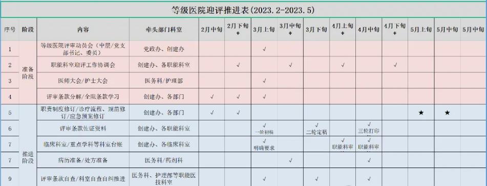 各家醫(yī)院在迎評(píng)啟動(dòng)期,首先要統(tǒng)一認(rèn)識(shí):避免以考試的心態(tài)應(yīng)對(duì),為了評(píng)審而評(píng)審,而是要把評(píng)審當(dāng)作抓手,以評(píng)促建、以評(píng)促進(jìn)、以評(píng)促精,推進(jìn)年度重點(diǎn)工作;其次要明確等級(jí)評(píng)審是一項(xiàng)全院行動(dòng)、全員參與通力合作才能完成的工作,要發(fā)動(dòng)全體院領(lǐng)導(dǎo)、中層干部、一線員工全流程全方位開(kāi)展迎評(píng)整改工作;同步要制定醫(yī)院、科室(個(gè)人)迎評(píng)計(jì)劃,責(zé)任到人,相關(guān)職能部門(mén)主動(dòng)檢查、督促整改,通過(guò)科室自查互查、職能部門(mén)督查、院領(lǐng)導(dǎo)巡查,全方位無(wú)死角的發(fā)現(xiàn)不足,制定對(duì)策,持續(xù)改進(jìn)。