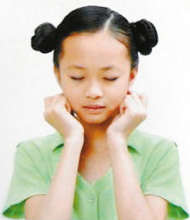 用雙手食指分別按在兩側(cè)穴位處。大拇指抵在下頜凹陷處,其它手指握緊。每拍一圈,做四個(gè)八拍。