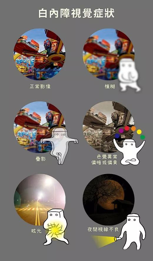 最常見的癥狀是:“視界”變得有云霧,模糊;物體顏色似乎變淡了;大燈、太陽光等會讓你覺得太亮,光線周圍還會出現(xiàn)光暈;夜間視力變差;眼鏡度數(shù)經(jīng)常變化等。