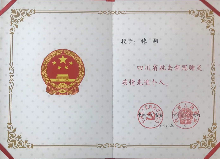 在病區(qū),張翔除了看病、查房,他還坐上負壓救護車共出診過3次,接回確診患者5人。因為前期人手不足,剛進艙時,他需要連續(xù)值完24小時的班后才能休息。為了節(jié)約防護物資,他整天不喝水,以減少上廁所的頻次。長時間身著防護服、隔離衣以及佩戴口罩、護目鏡帶來的壓抑感讓他出現(xiàn)了胸悶、頭暈、體力不支等情況。他努力克服高強度工作帶來的各種不適感和心理壓力,與病魔爭分奪秒。在他和進倉同事的精心救治和共同努力下,3例危、重癥患者病情逐漸趨于穩(wěn)定,2例感染患者成功治愈,成為瀘州市首批治愈出院的患者。面對這一切,張翔說,自己是羌族小伙,2008年汶川大地震,家鄉(xiāng)茂縣也受到了影響,那時因為還在讀書,沒有這個能力,現(xiàn)在有這個能力了,也是該自己出力的時候了。張翔表示,將珍惜這份榮譽,在今后的工作中繼續(xù)發(fā)揚“生命至上、舉國同心、舍生忘死、尊重科學、命運與共”的偉大抗疫精神,倍加努力,為人民群眾的健康保駕護航。