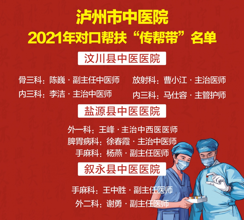 2021年是“十四五”規(guī)劃的開(kāi)局之年,為進(jìn)一步夯實(shí)我院對(duì)口支援工作,鞏固幫扶成果,助力疫情防控,豐富支援模式,推動(dòng)對(duì)口支援“傳幫帶”工程取得更大成效。1月4日醫(yī)院黨委副書(shū)記李定軍帶隊(duì),將受援單位需要的、個(gè)人主動(dòng)報(bào)名申請(qǐng)的、醫(yī)院精心挑選的,既有專(zhuān)業(yè)技能又有管理經(jīng)驗(yàn)的9名醫(yī)務(wù)人員送往汶川縣中醫(yī)醫(yī)院、鹽源縣中醫(yī)醫(yī)院、敘永縣中醫(yī)醫(yī)院3個(gè)受援醫(yī)院,開(kāi)展為期一年的“傳幫帶”工程工作。