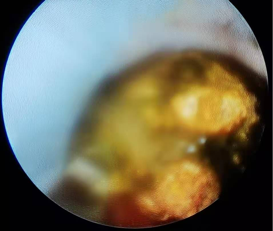 術(shù)中,醫(yī)生通過竇道直達結(jié)石部位,使用內(nèi)鏡配合鈥激光碎石,取出大量結(jié)石。一周后,在局麻下經(jīng)T管竇道再次用膽道鏡探查并將剩余的結(jié)石全部取出。